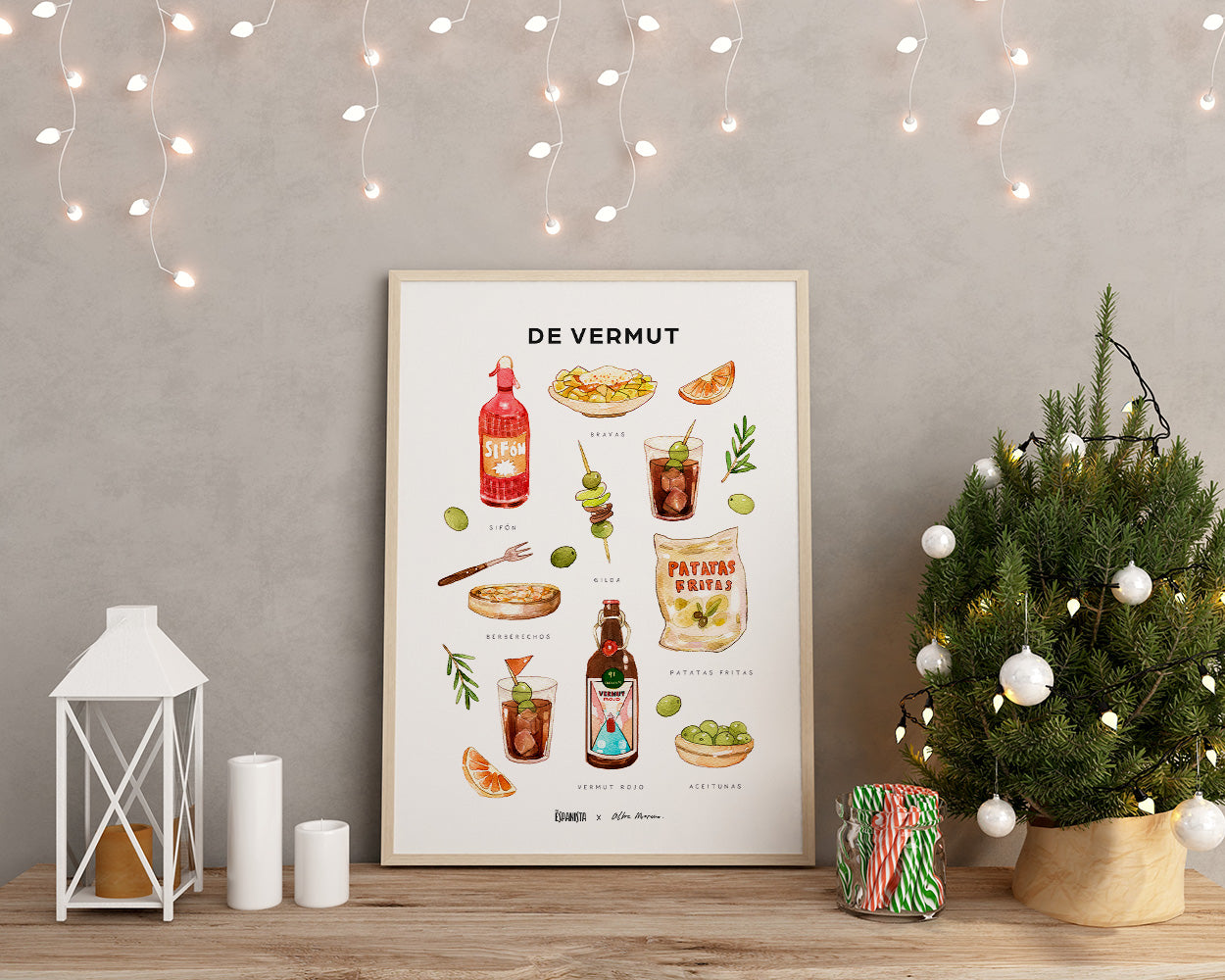 Un homenaje ilustrado al aperitivo más querido: el vermut. Esta escena reúne sus clásicos imprescindibles —aceitunas, sifón, patatas bravas, gilda, berberechos y vermut rojo— en una composición fresca, nostálgica y llena de sabor. La acuarela suave y luminosa de Alba Moreno transmite la esencia relajada y alegre de este ritual tan mediterráneo.