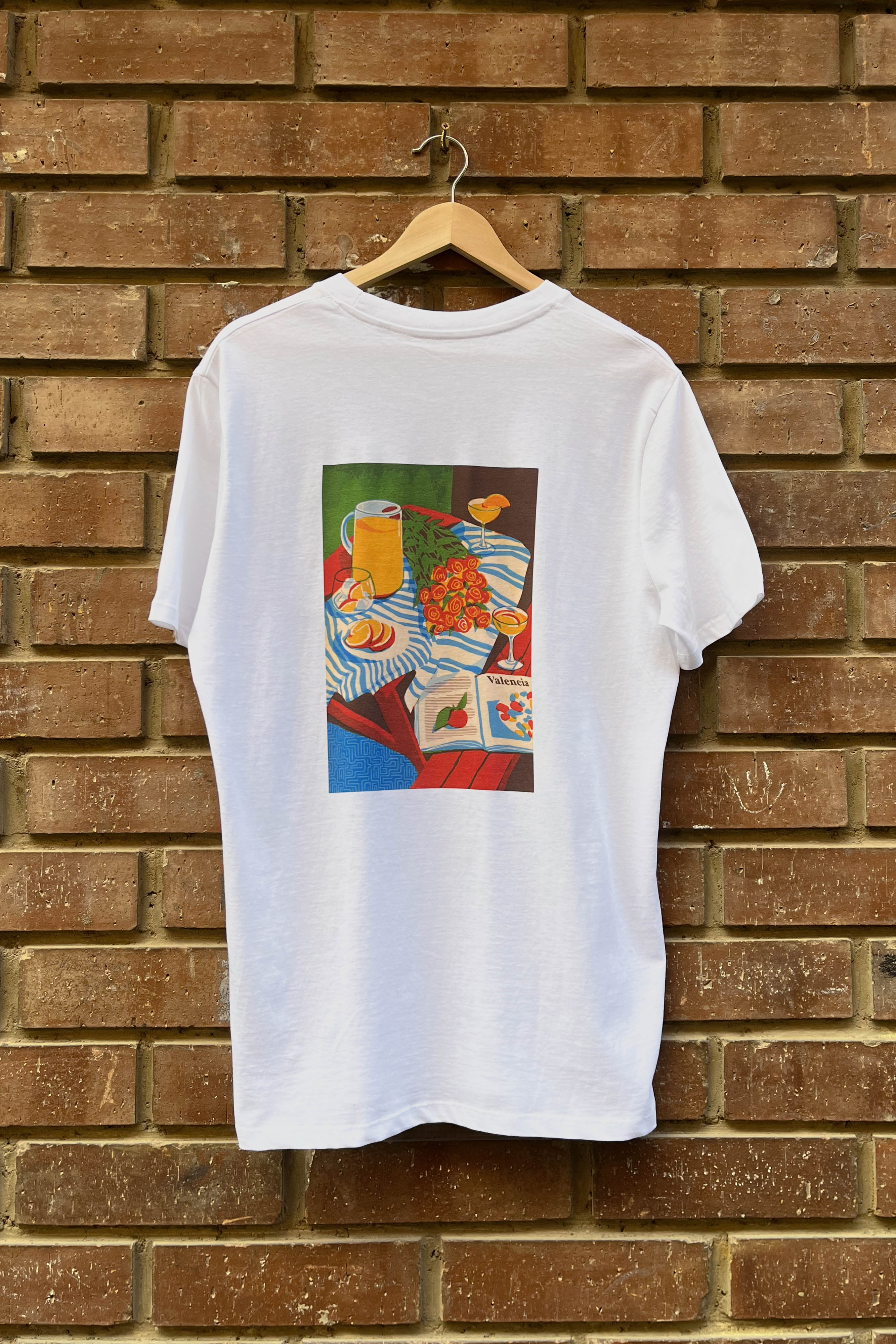 La ilustradora Ninnnnnki plasma en esta camiseta una escena íntima y colorista inspirada en la bebida más icónica de la ciudad: el Agua de Valencia.