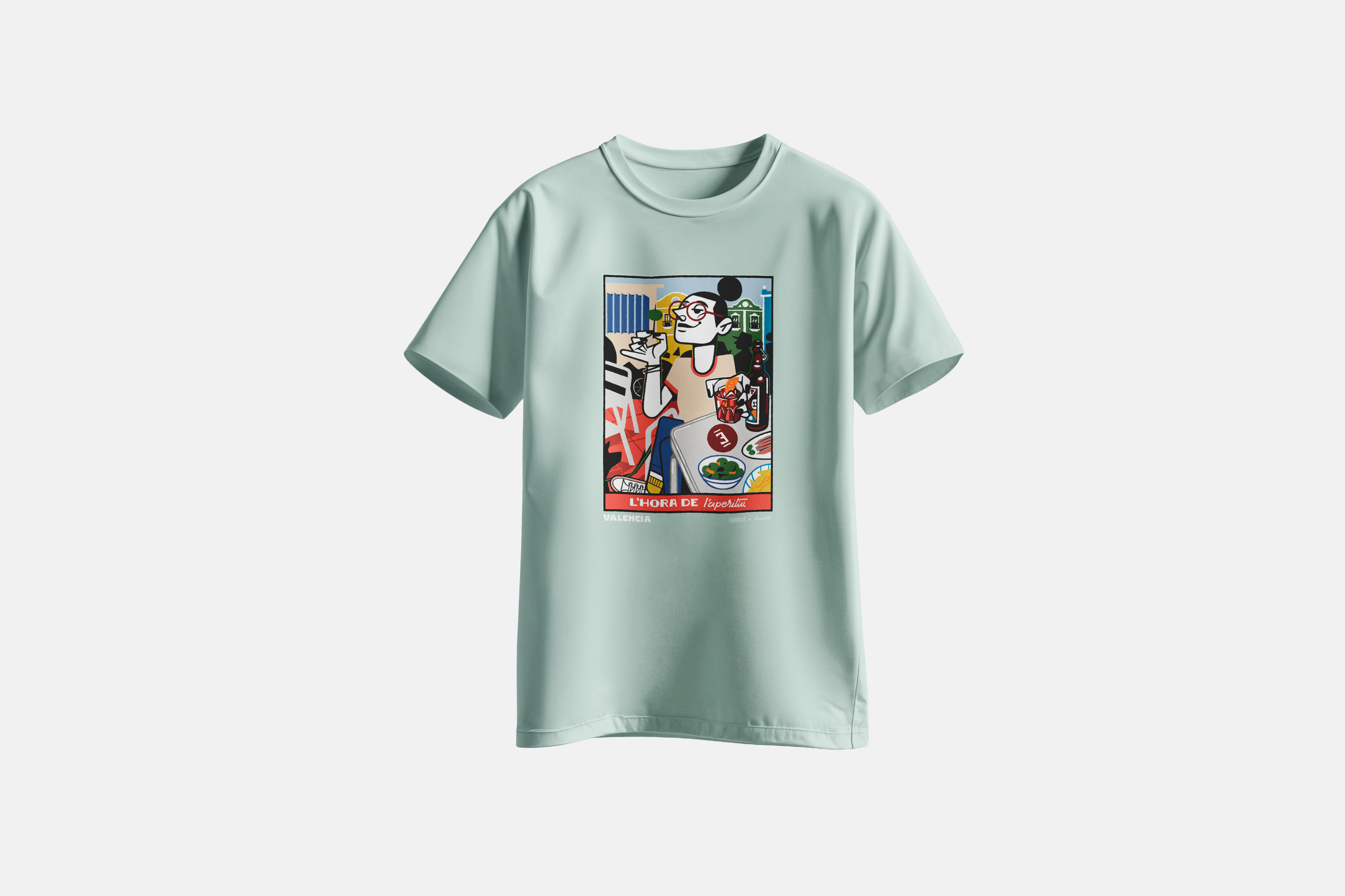 Esta camiseta "L’hora de l’aperitiu" ilustrada por Jorge Lawerta captura ese momento único de sentarse en una terraza a disfrutar del sol, las tapas, una cerveza bien fría y buena compañía.