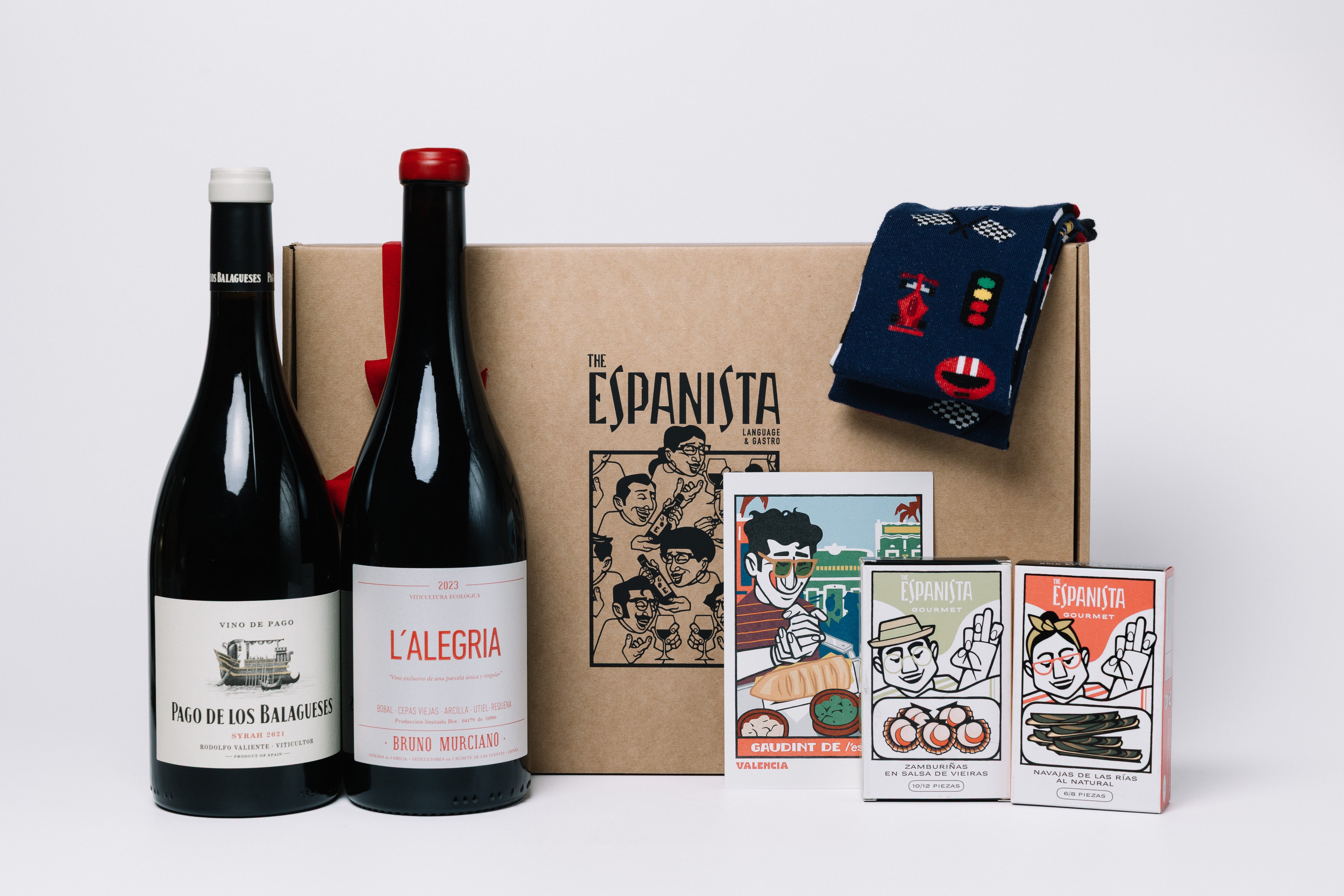 Este pack combina dos vinos valencianos con carácter —Pago de los Balagueses 75 cl y L’Alegría de Bruno Murciano 75 cl— junto a dos conservas gourmet de The Espanista: zamburiñas en salsa de vieira y navajas al natural. Una combinación perfecta para un aperitivo especial o una cena improvisada.