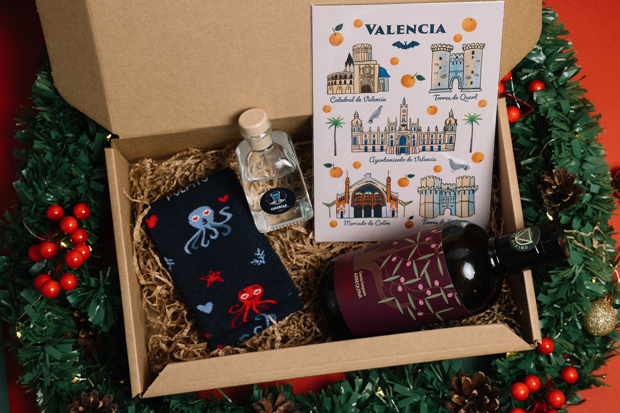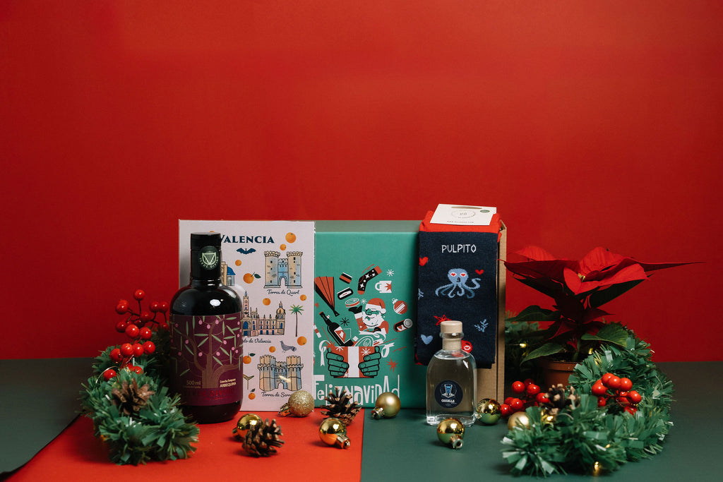 La Caja Mediterráneo a tus Pies reúne sabores, arte y pequeños guiños a la esencia valenciana: aceite de oliva de calidad, una ilustración que huele a mar, un licor tradicional y unos calcetines divertidos para completar el viaje.