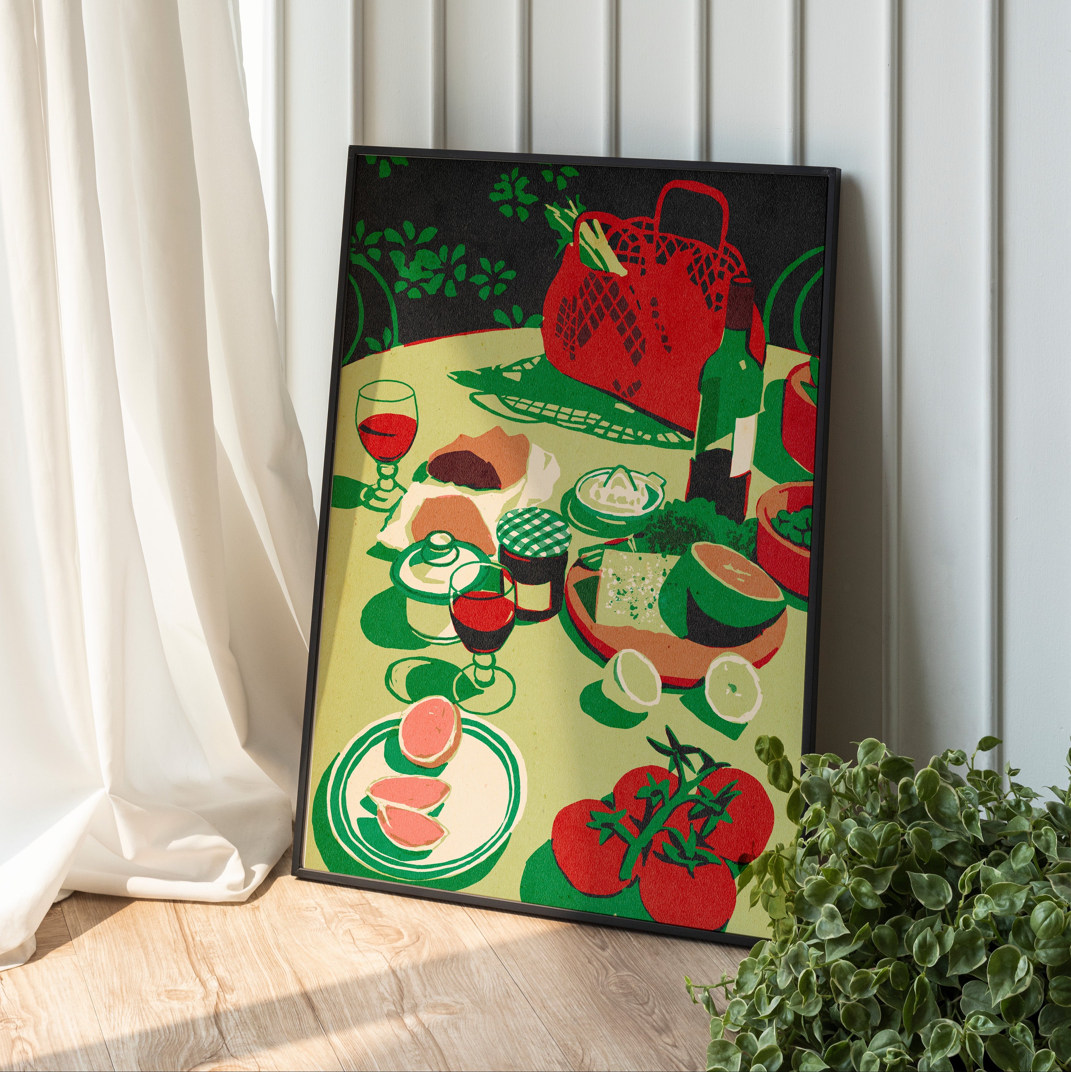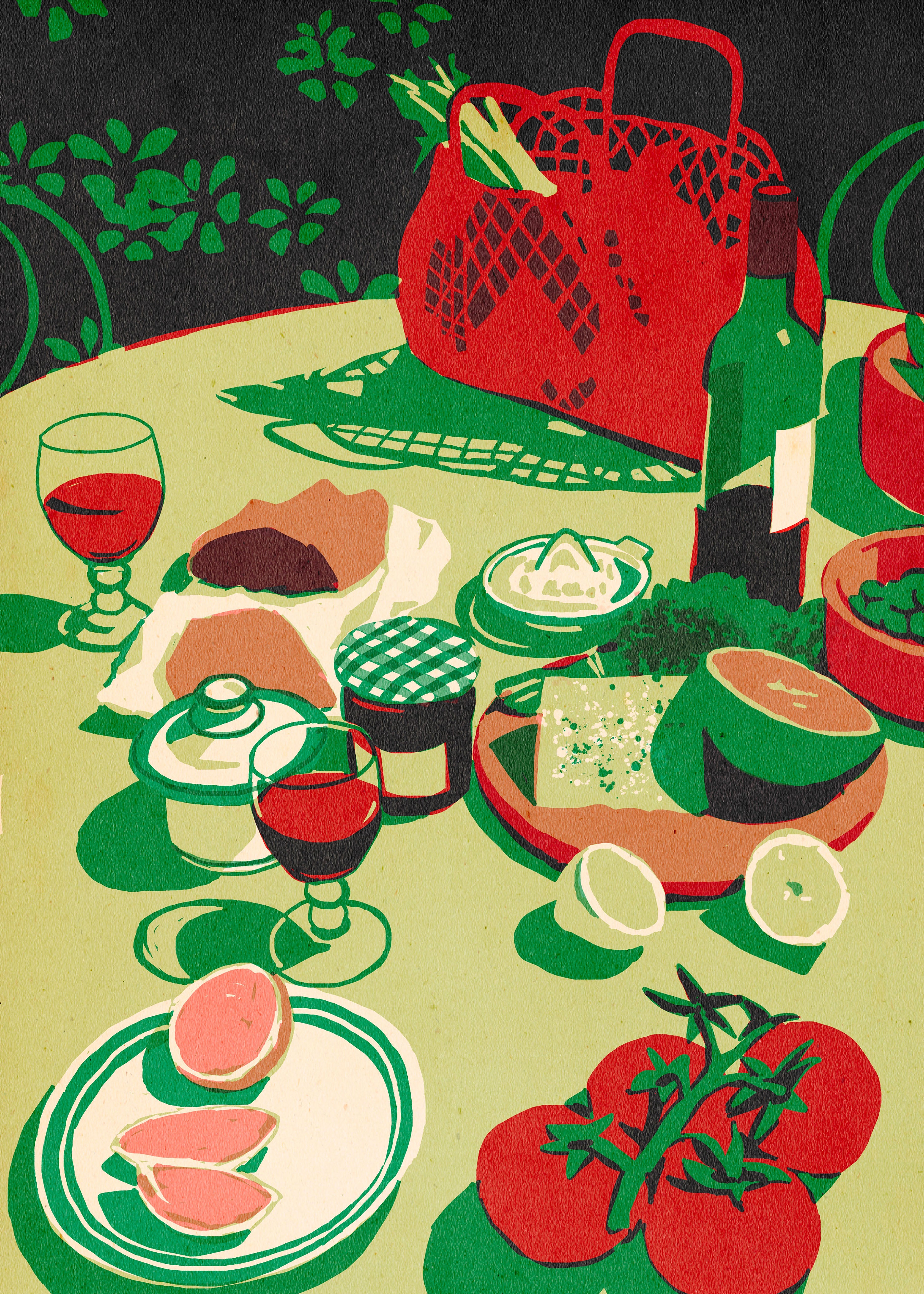 Una mesa al aire libre, tomates recién cortados, pan, vino, una bolsa de mercado y el sol cayendo lento. A Slice of Summer es una ilustración que habla de eso: del placer sencillo, de la cultura mediterránea y de los días que se recuerdan por lo que se compartió.